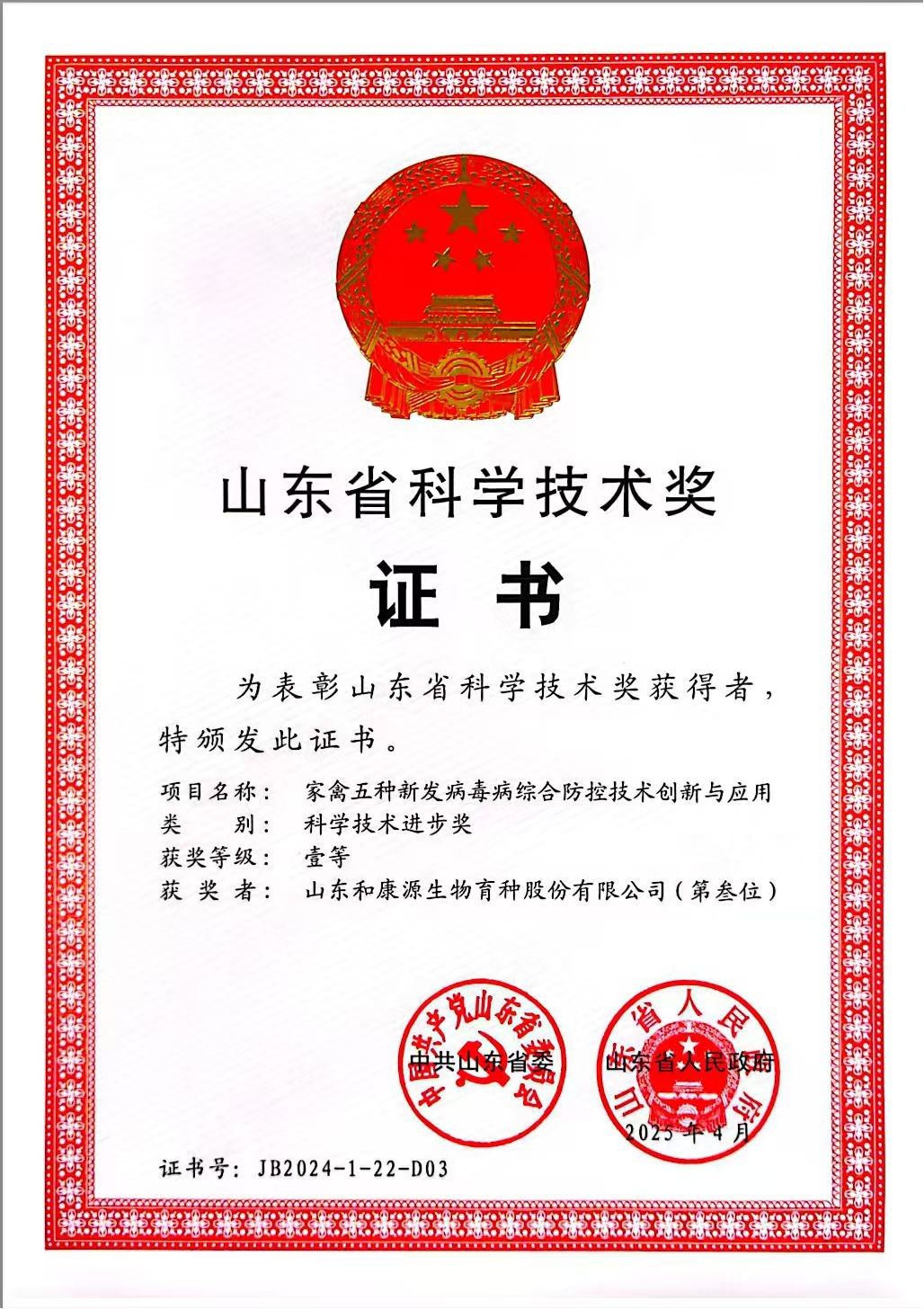 First Prize of Shandong Province Science and Technology Progress Award